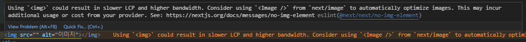 Next.js에서 이미지태그를 사용하면 아래 사진과 같은 주의 문구를 보신 적이 있을 실 겁니다.