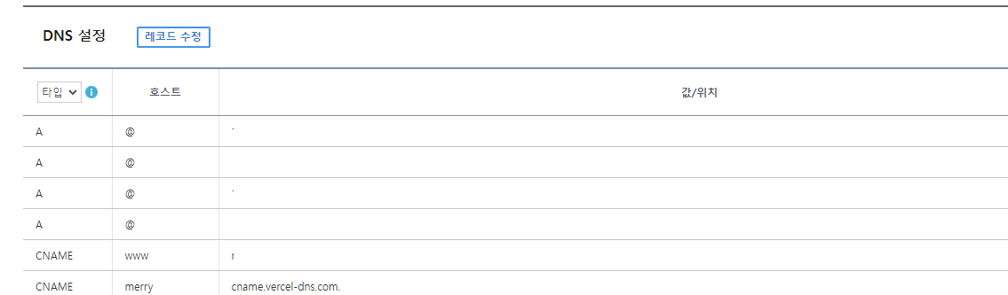 다시 레코드 수정을 통해 CNAME 값도 추가합니다.