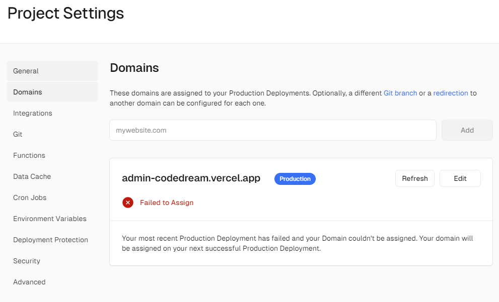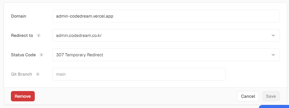 추가로 Vercel에서 제공해주는 도메인을 새로 연결한 도메인으로 리다이렉트 시켜줍니다.