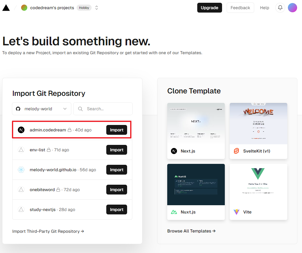 코드드림 어드민은 Next.js로 개발한만큼 Vercel을 이용해 배포하기로 했습니다. Next.js를 Vercel사에서 만들기도 했고, 배포 또한 매우 쉽다고 하니 고민할 필요도 없었습니다.