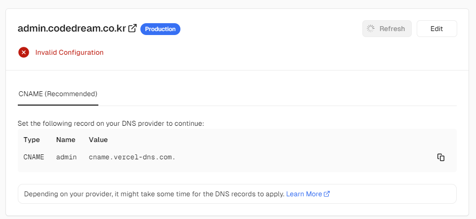입력이 완료되면 실시간으로 도메인 체크가 되는데 이 때, CNAME을 추가로 등록해달라는 내용이 확인됩니다.