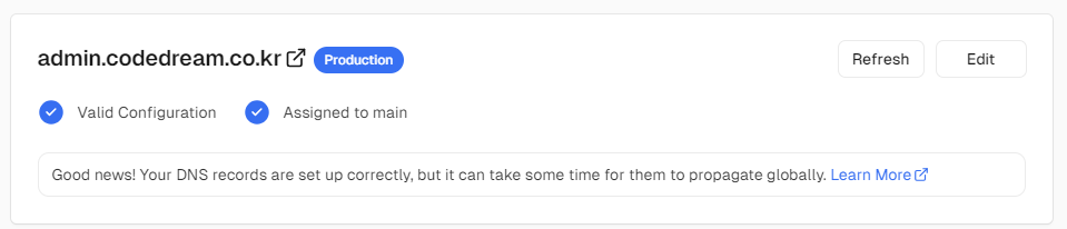 추가로 Vercel에서 제공해주는 도메인을 새로 연결한 도메인으로 리다이렉트 시켜줍니다.