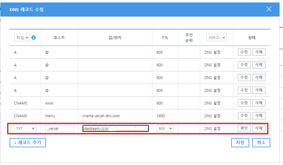 상단에서 확인한 TXT 값을 순서대로 입력하고 저장합니다.