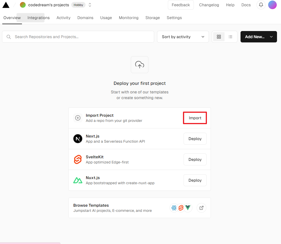 1-2) 배포하려는 프로젝트를 import 합니다.