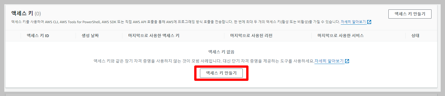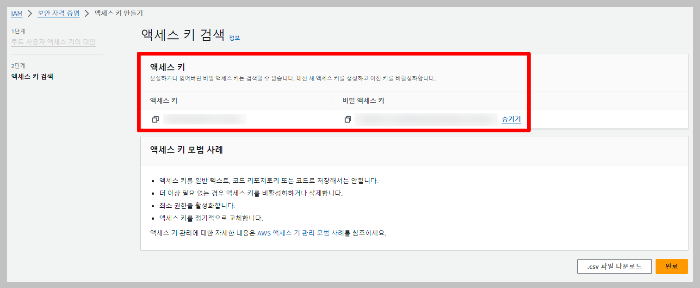 [ 엑세스 키 만들기 ]를 누르면 엑세스 키가 발급됩니다.