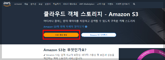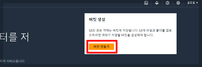 상단 검색을 이용해 S3 서비스를 클릭 후,버킷을 생성합니다.