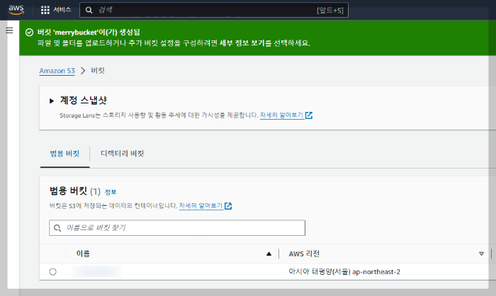 저희가 설정한 구성과 이름으로 새 버킷이 생성되었습니다.