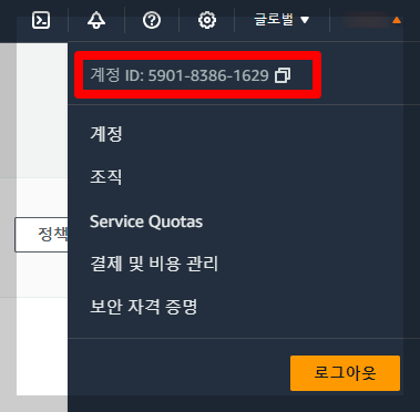 AWS계정 ID:root는 화면 오른쪽 상단을 누르면 확인하실 수 있습니다.