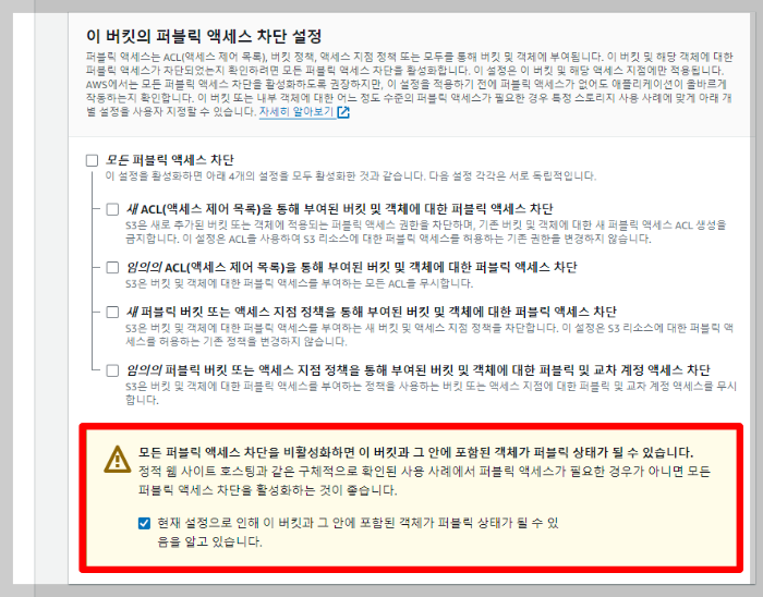 개발의 편의성을 높이기 위해 퍼블릭 엑세스 또한 아래 사진과 동일하게 해제해 줍니다.