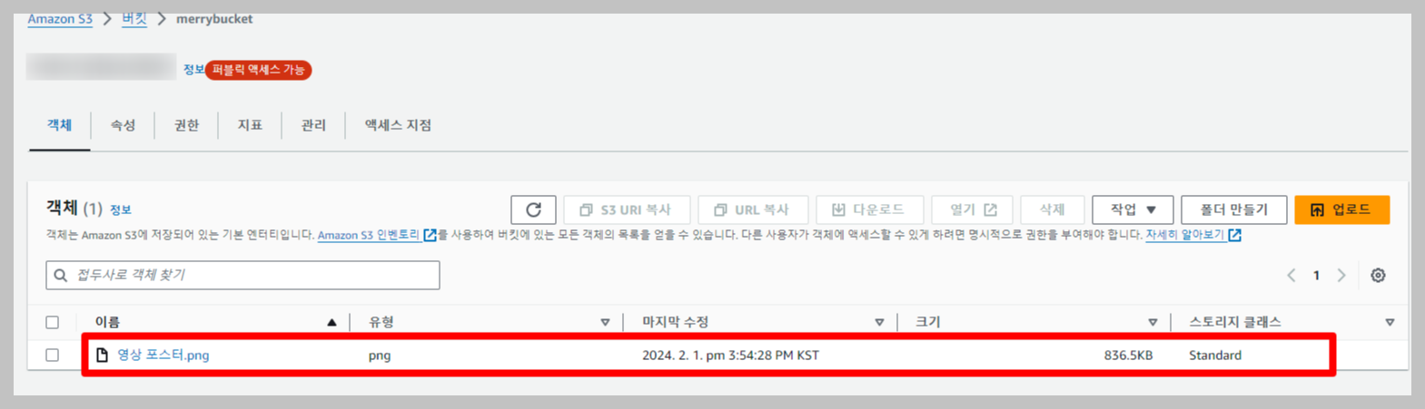 객체 소유권 : ACL 비활성화됨 (권장)
