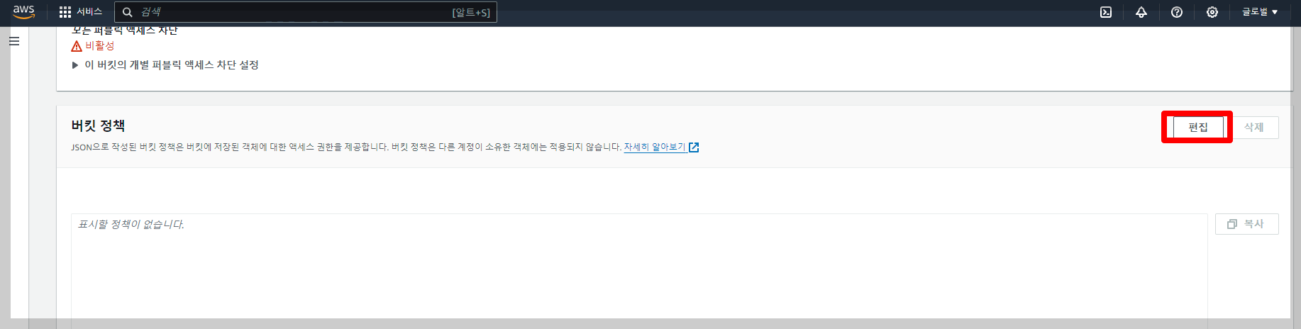 그럼 이 버킷의 정책을 수정해 봅시다.