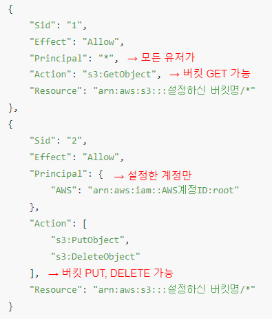 버킷 정책은 누가, 버킷을 읽고 수정, 삭제할 수 있는지 권한을 정의하는 것입니다.