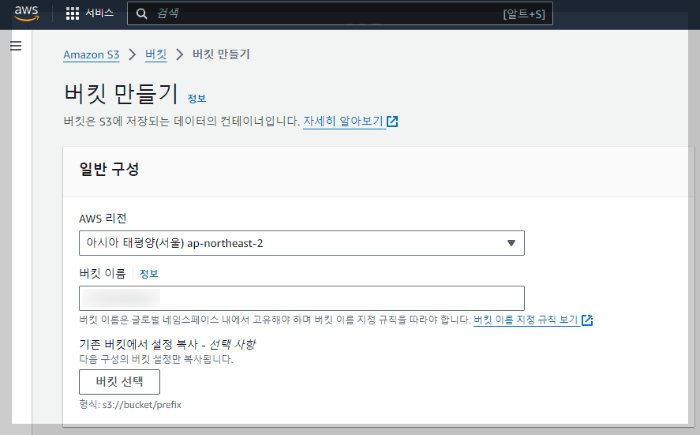 버킷은 저장공간입니다. 원하는 버킷이름을 입력해 줍니다.