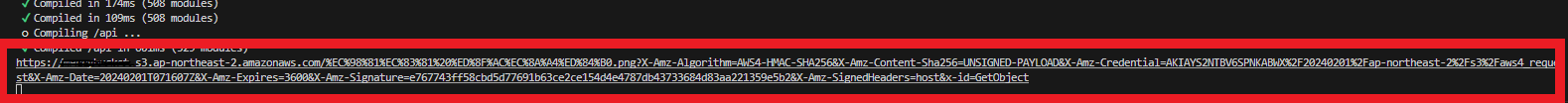 콘솔을 찍어보면 아래와 같이 터미널에 이미지 주소가 찍힌 모습을 볼 수 있습니다.