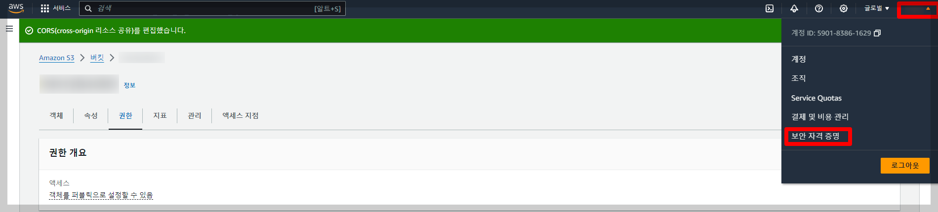 오른쪽 상단 계정이름을 클릭 후 [ 보안 자격 증명 ]을 클릭합니다.