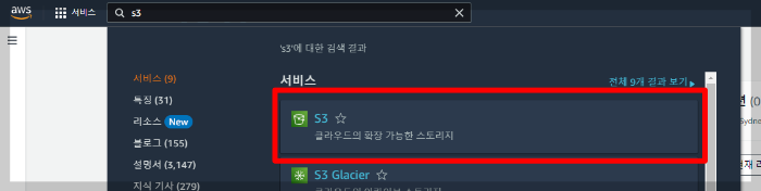 상단 검색을 이용해 S3 서비스를 클릭 후,버킷을 생성합니다.
