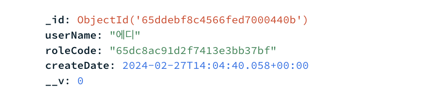 두번째 인자값에서는 $addFields - $toObjectId를 통해 users 컬렉션의 roleCode를 ObjectId로 변환하는 작업을 한 뒤 roleCode로 반환했습니다. 이 값을 통해 roles 컬렉션의 _id와 비교하게 됩니다.