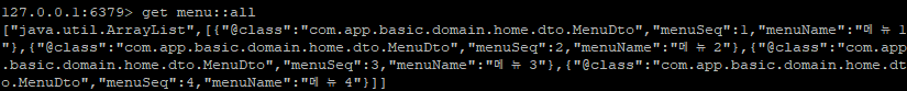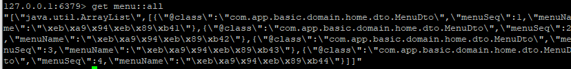 캐시명 설정을 통해 menu::all 로 데이터가 저장이 되었고 조회시에는 직렬화된 메뉴 데이터가 확인됩니다. 데이터를 한글로 보고 싶은 경우 redis-cli --raw로 redis에 접속할 수 있습니다.