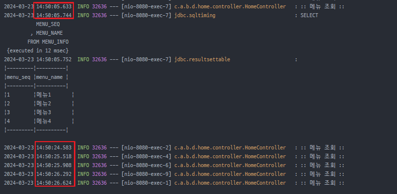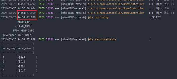 그리고 캐시 만료시간인 60초가 지난 후에는 다시 DB를 조회해 반환하는 것을 알 수 있습니다.
