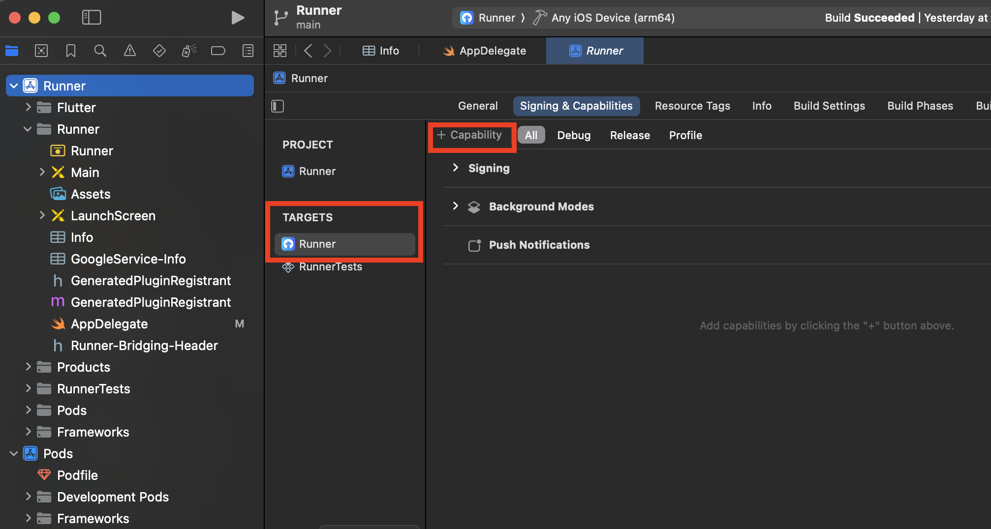 Runner - TARGETS(Runner)에 Capability 추가를 클릭해 Background ModesPush Notifications를 추가합니다.