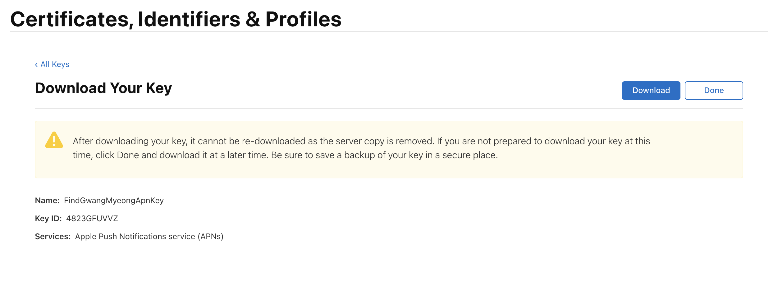 iOS에서는 파이어베이스의 클라우드 메세지를 APN이라는 서비스를 통해 받게 됩니다. 이를 위해 APN 인증서를 파이어베이스에 등록해주어야 하는데 인증서 방식과 인증키 방식이 존재합니다.