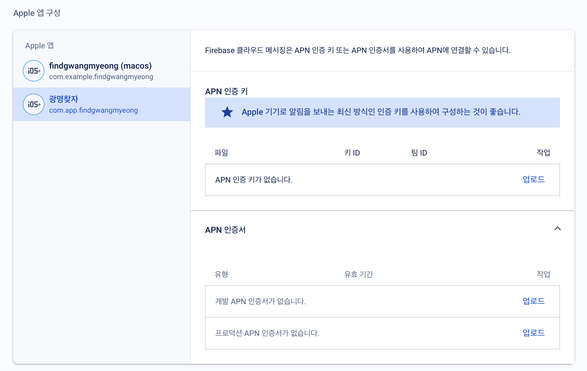 2-2) 클라우드 메시징 - Apple 앱 구성에 APN 인증 키 업로드를 클릭합니다.