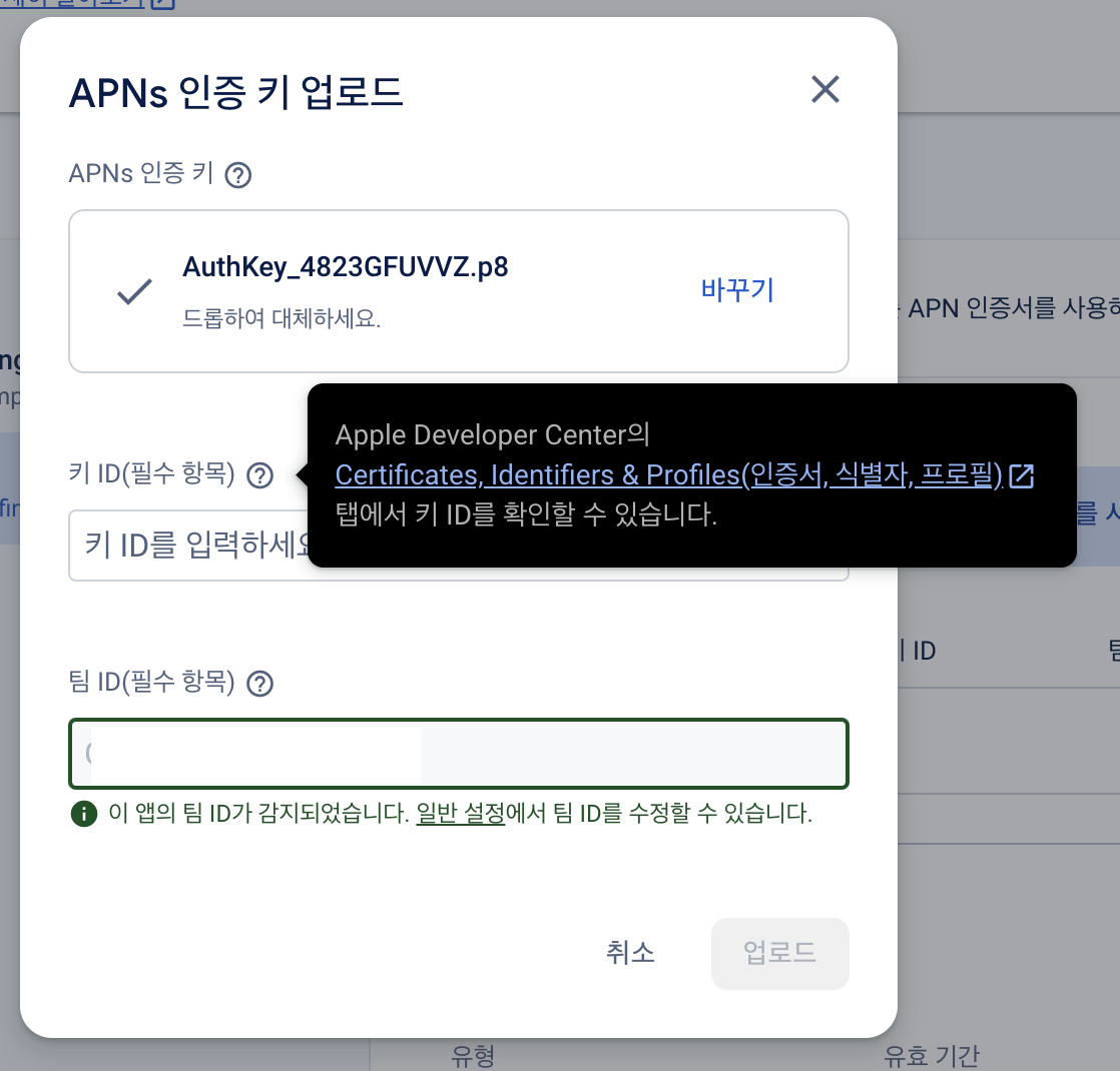 2-3) 1-4)에서 다운받은 키(.p8)를 업로드합니다. 그리고 생성된 키의 ID를 입력합니다.