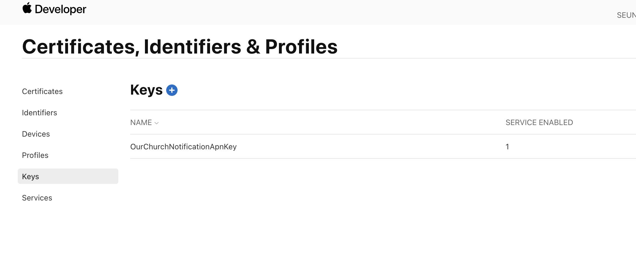 1-1) 키 생성을 위해 애플 개발자에 접속합니다. Keys 메뉴로 들어가 추가 버튼을 클릭합니다.