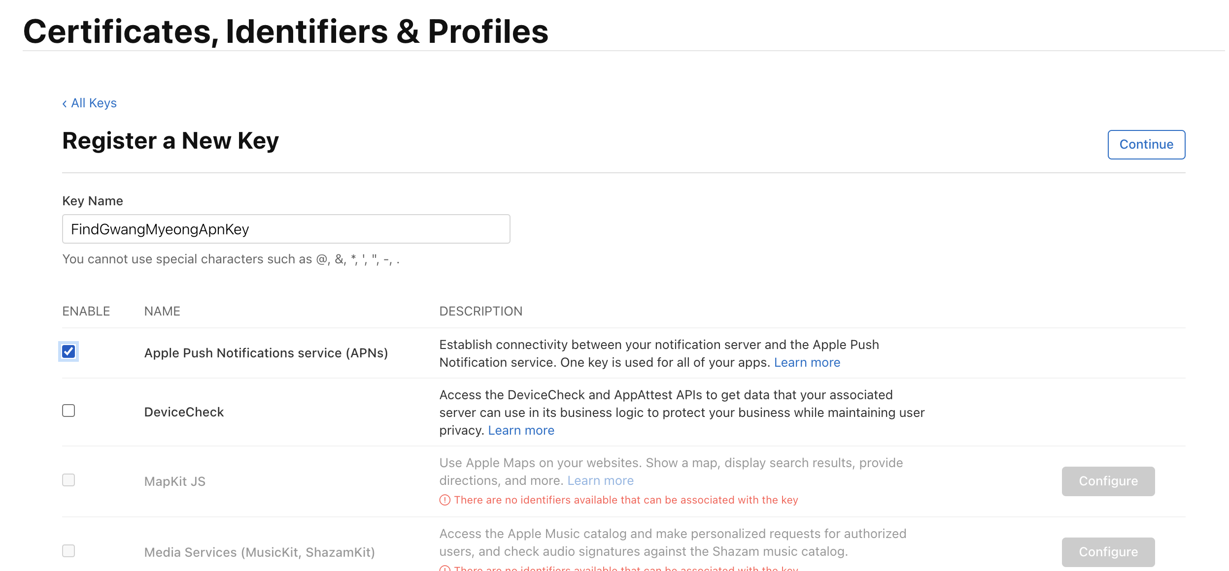 1-2) Apple Push Notifications service (APNs) 클릭 후 다음으로 넘어갑니다.
