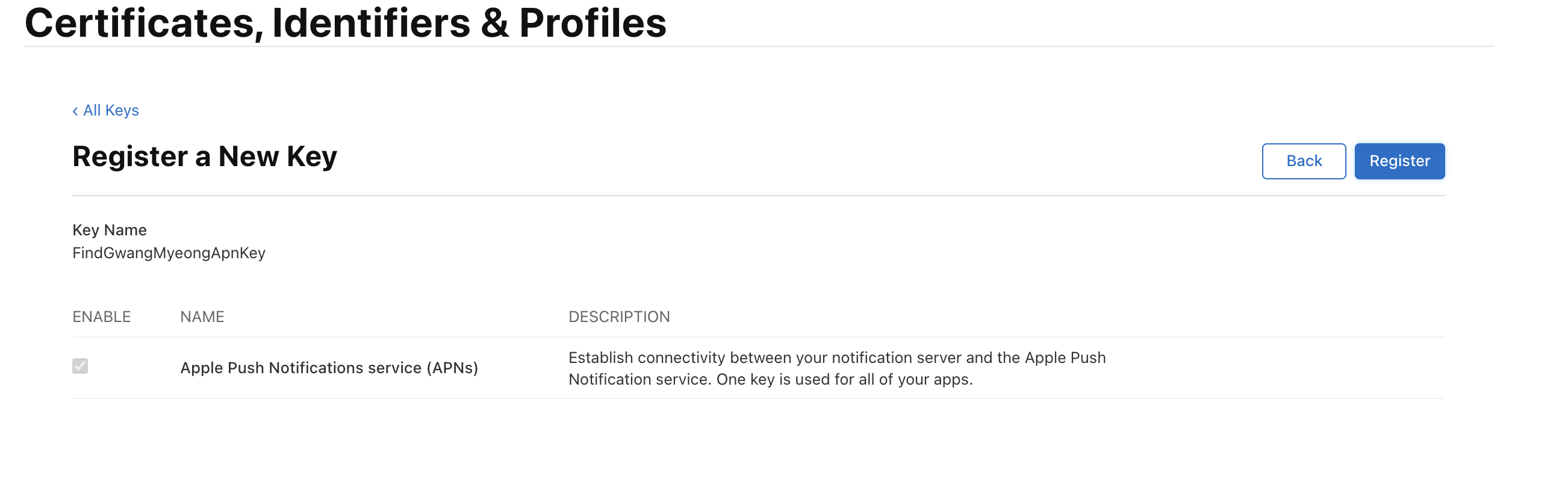 1-2) Apple Push Notifications service (APNs) 클릭 후 다음으로 넘어갑니다.