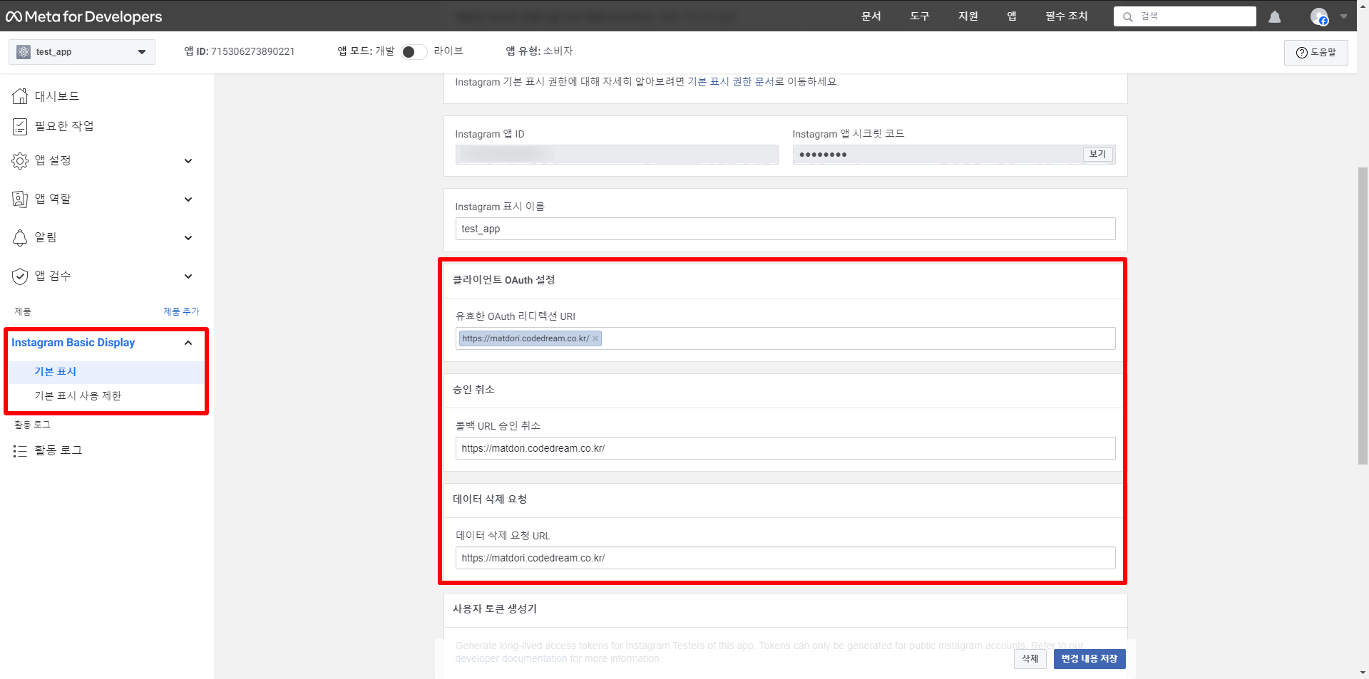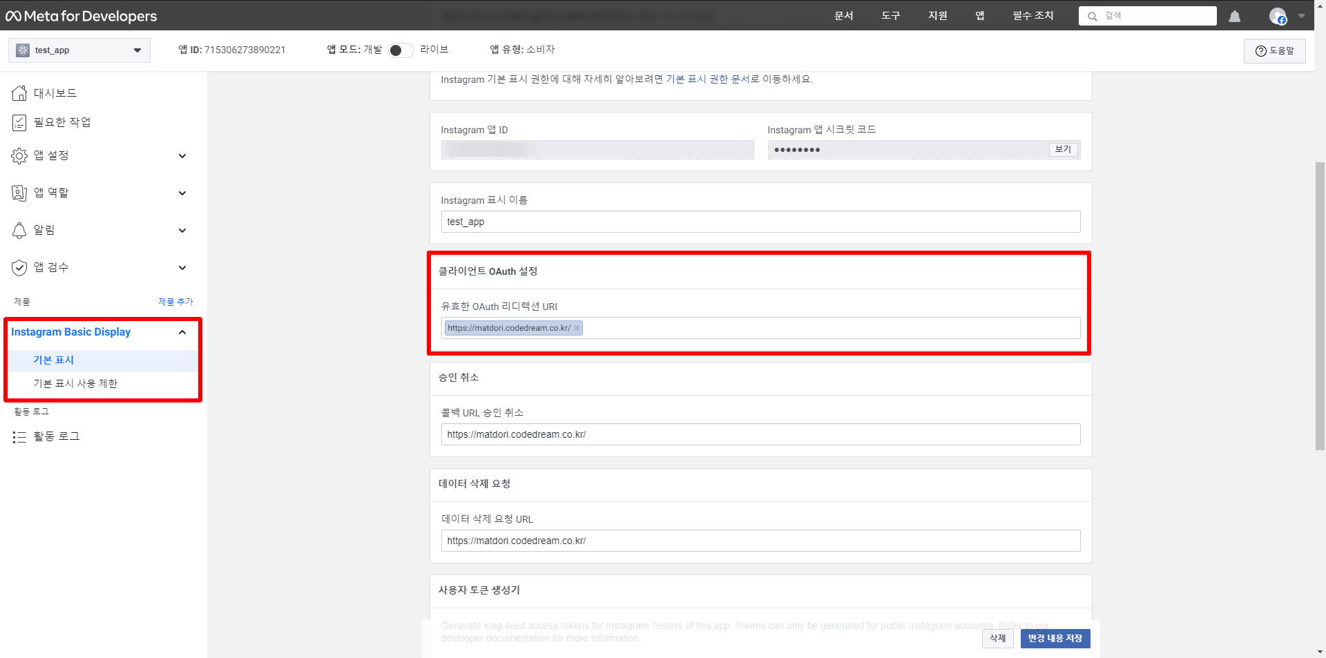 | client_secret | 앱 대시보드 > 제품> Instagram Basic Display > 기본 표시 > Instagram 앱 시크립 코드 | |