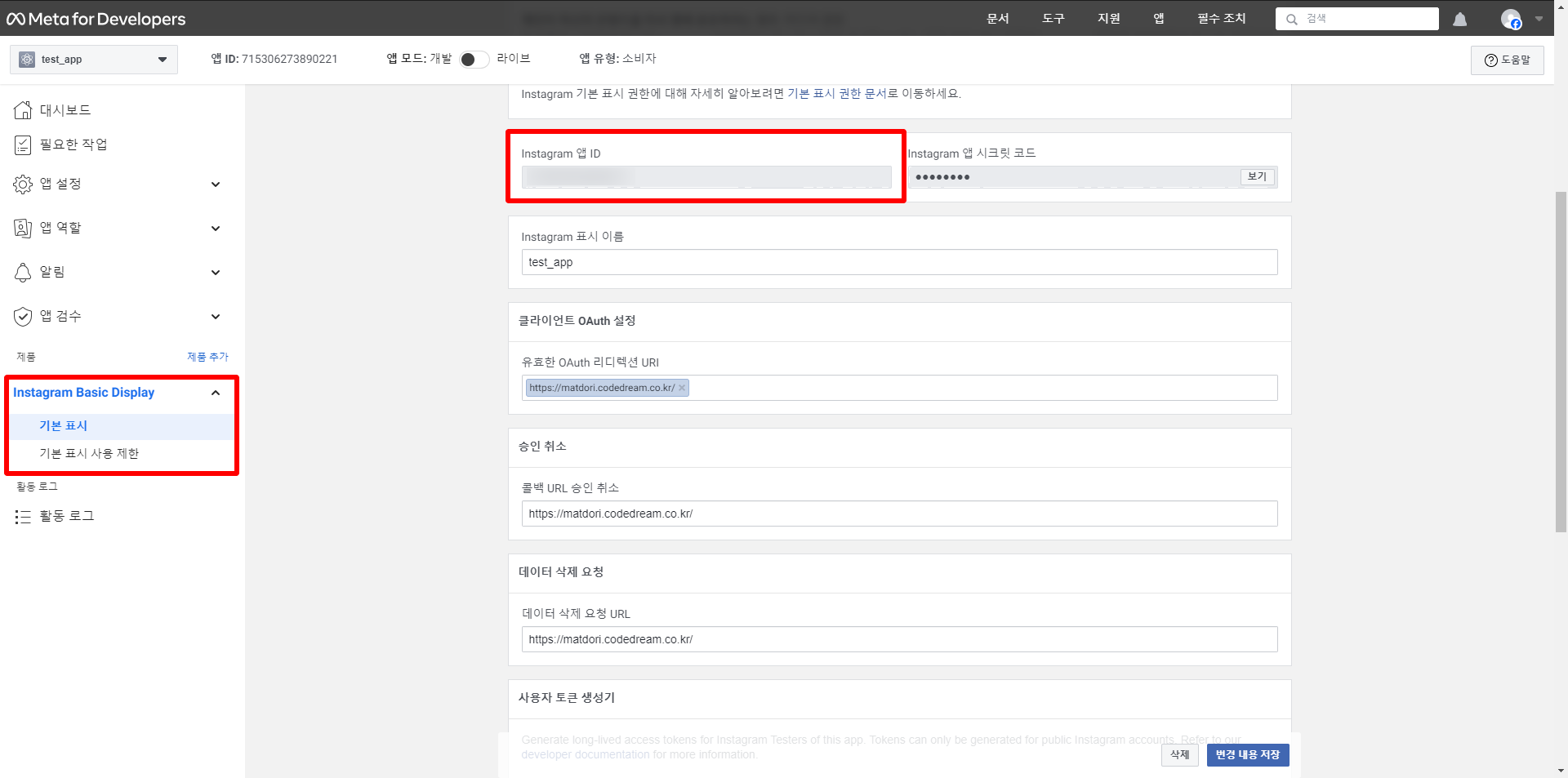 | client_secret | 앱 대시보드 > 제품> Instagram Basic Display > 기본 표시 > Instagram 앱 시크립 코드 |