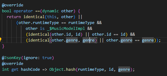 other is Music && runtimeType == other.runtimeType && id == other.id && genre == other.genre;