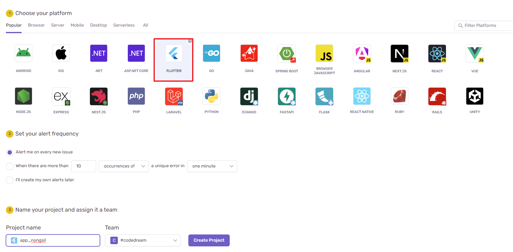 Flutter 프로젝트를 실행하고 sentry_flutter를 추가합니다.