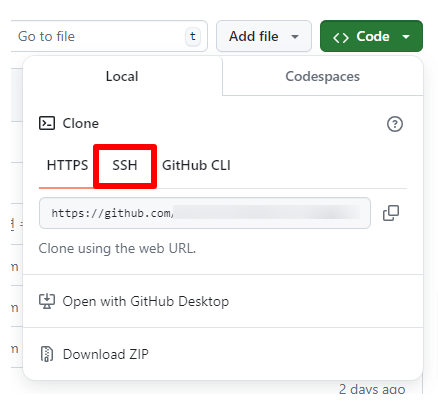 다음으로 기존에 클론 받았던 레포지토리를 HTTPS > SSH로 변경합니다.