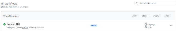 여기까지 되셨다면 아무거나 master 브랜치에 커밋 후 워크플로우가 정상 실행 되는지 확인해 봅니다.