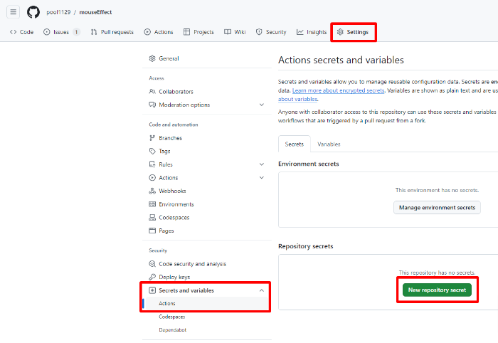 아래 사진처럼 레포지토리 시크릿키를 생성해 줍니다.