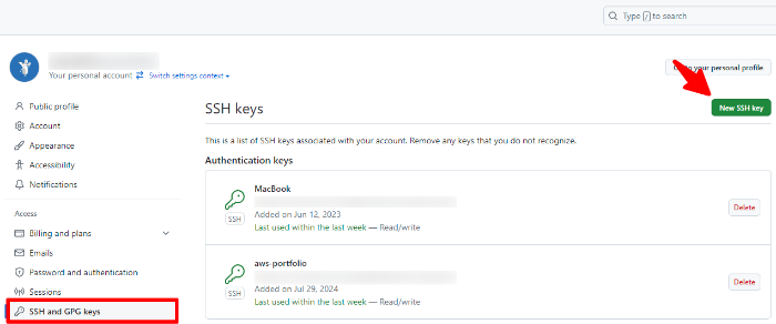 깃허브 Settings > SSH and GPG keys로 이동합니다.
