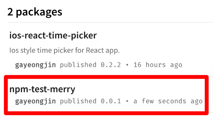 정상적으로 배포되면 위와 같은 모습을 확인할 수 있습니다. 또한, npm 사이트의 계정 packages에서도 확인 할 수 있습니다.
