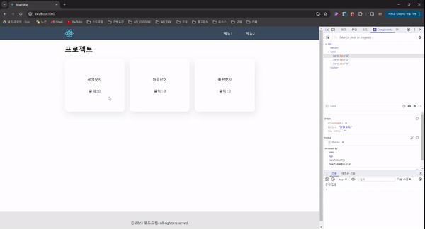 카드가 렌더링될 때 마다 로그가 찍히는 것을 보니 상태가 변할 때에도(리렌더링이 발생하게 되면서) 역시 로그가 찍힐 것 같습니다.