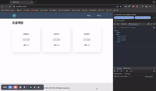 기존 카드 컴포넌트의 [+][-] 버튼을 클릭하면 '카드가 클릭되었습니다' 라는 문구가 [x] 버튼을 클릭하면 '카드가 삭제됩니다'라는 문구가 조회됩니다.