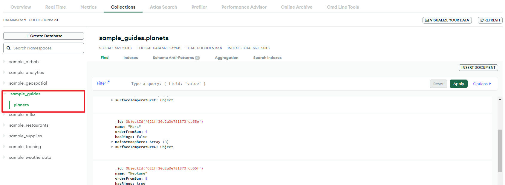 본 포스팅에서는 sample_guides 데이터베이스의 Planets 컬렉션을 사용했습니다.