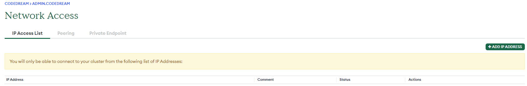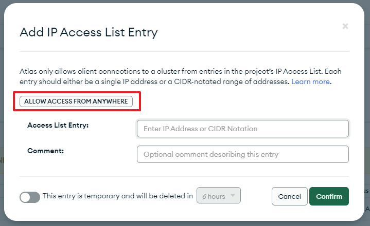 ADD IP ADDRESS 클릭 후 ALLOW ACCESS FROM ANYWHERE을 통해 0.0.0.0/0 IP를 추가합니다.