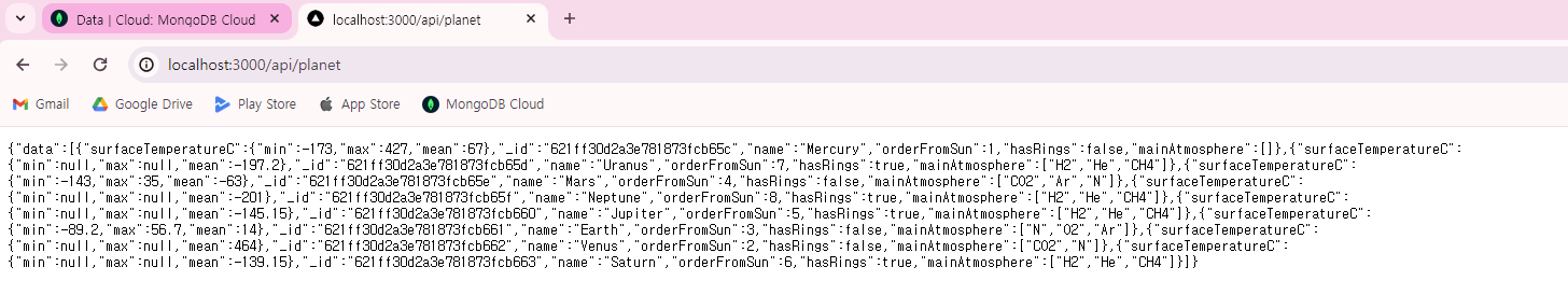 npm run dev를 통해 서버를 실행하고 /api/planet으로 접속해봅니다.